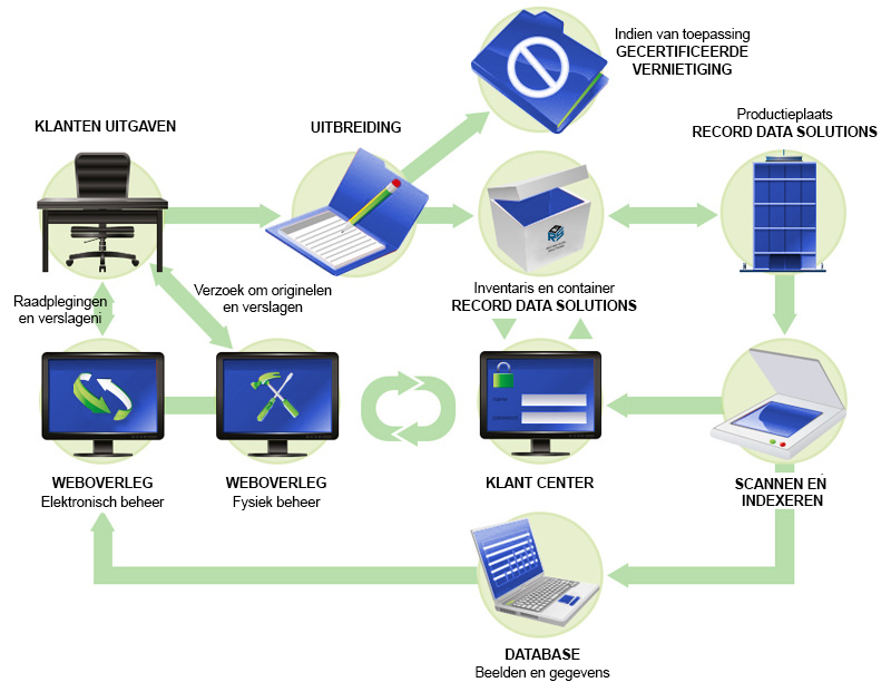 Bewaring van documenten Verzameling / overdracht van documenten Query documenten Custody Center Organisatie van documentaire collecties Scannen van documenten Vernietiging van documenten RECORD DATA SOLUTIONS - Werkmethode Klik om de afbeelding te vergroten In die zin behoren we tot de meest veeleisende internationale verenigingen in de controle en garantie van documentatie.